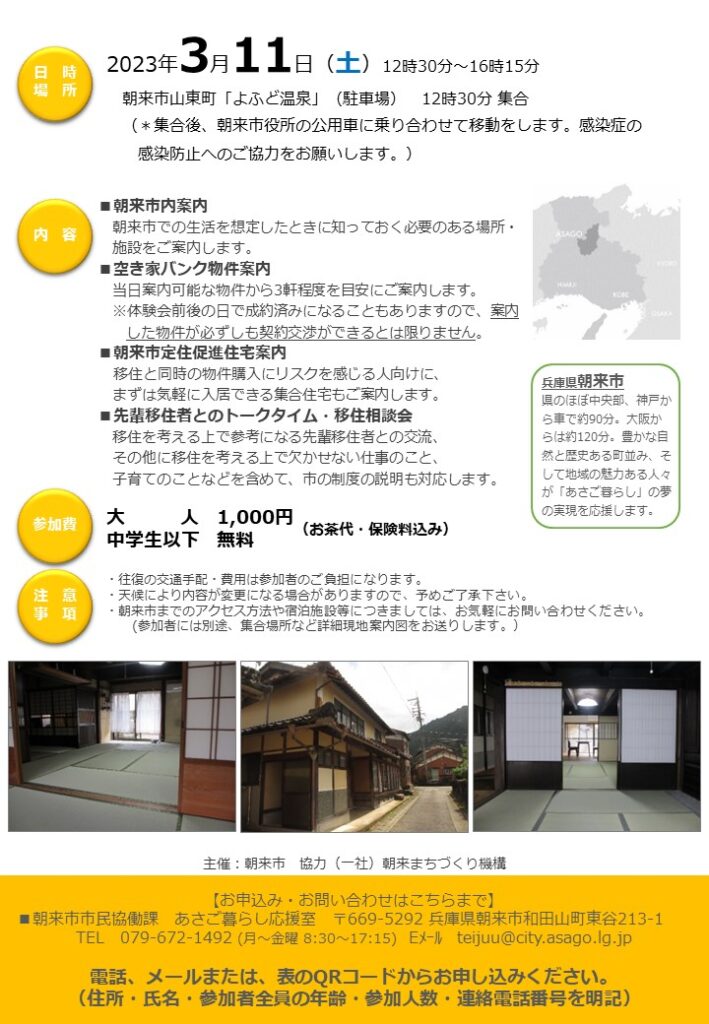 本来、朝来市の空き家バンクをご利用いただくには、事前に利用者登録という手続きが必要になるのですが、今回はその利用者登録をいただいていない方でもご参加でき、しかも半日をかけて複数を内覧できるというめったにない豪華な(?)内容となっています。