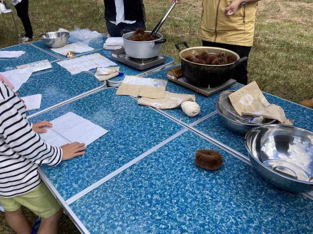 草木染体験。この日は拾ってきた“栗のイガ”を使って染めました。思った以上にしっかり染まります。