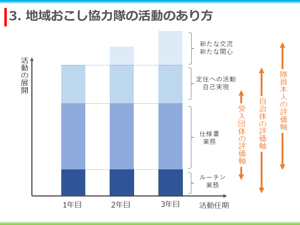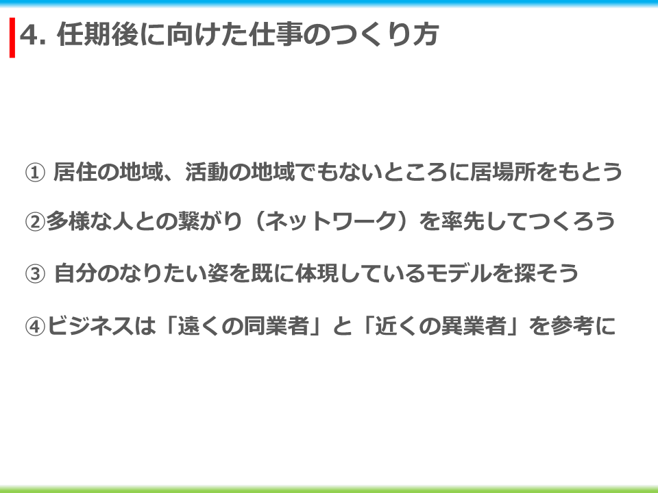 「地域おこし協力隊心得研修」では、着任された新任隊員のみを対象に、これからの協力隊活動に対して期待感をもってほしい、という前置きの上で、地域で活動する上で大切な視点をもつためにいくつかの言葉を対比という形で提示しました。