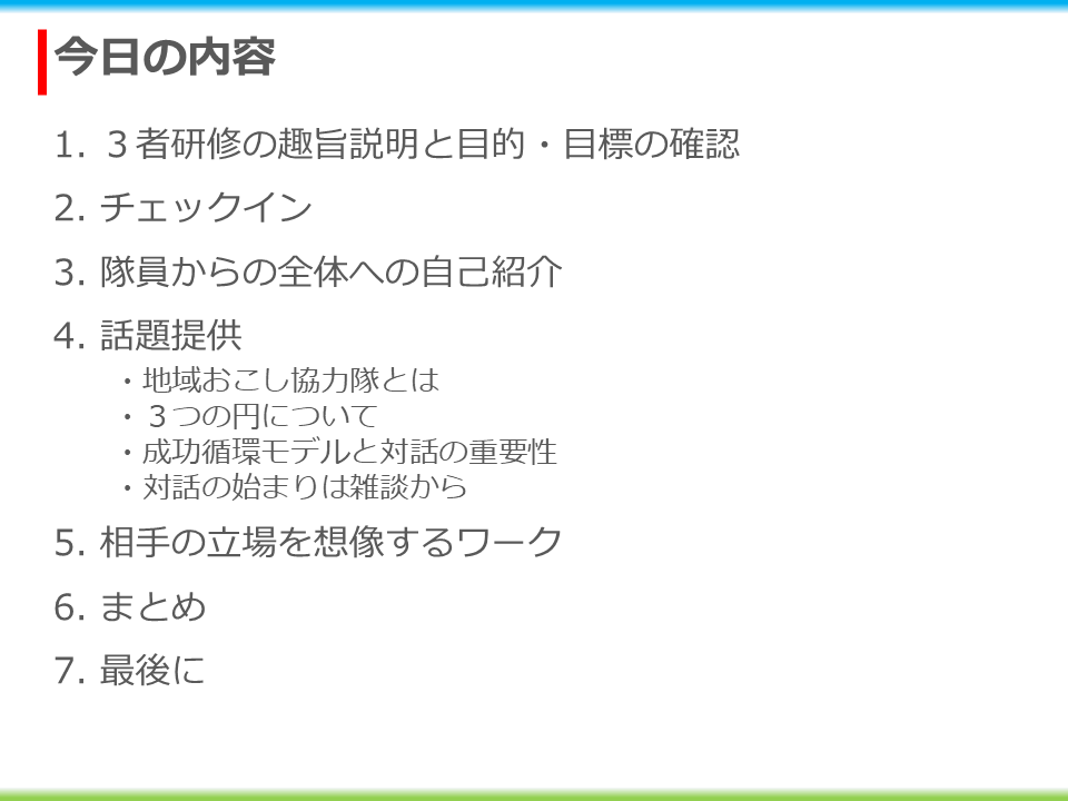 今日は、そんな三名とその受入れ団体を対象に研修をさせてもらいました。協力隊制度の再考の結果が朝来市の協力隊制度に近いものとなったため、必然的にその研修内容も朝来市のそれと近いものになります。