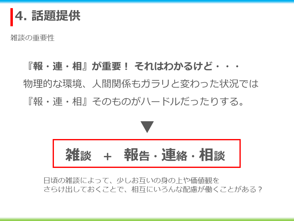 まずは、アイスブレイクがてらチェックインと自己紹介。次に、“成功循環モデル”の説明と日頃からの対話の重要性について根拠を添えながら解説をしました。そうしてある程度話がしやすい空気になってきたところで、全く異なる立場の3者のお互いの立場を想像する練習になるワークを行いました。